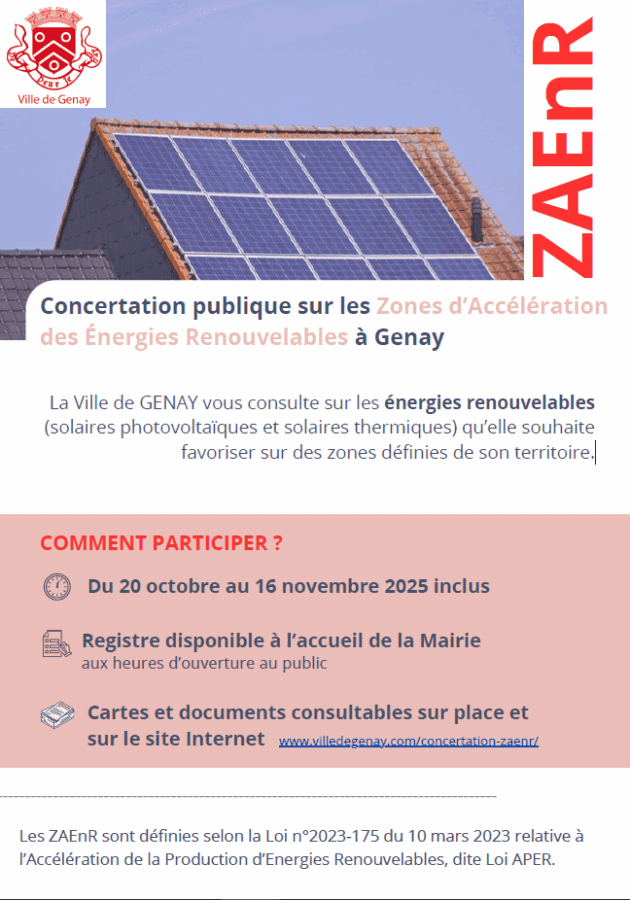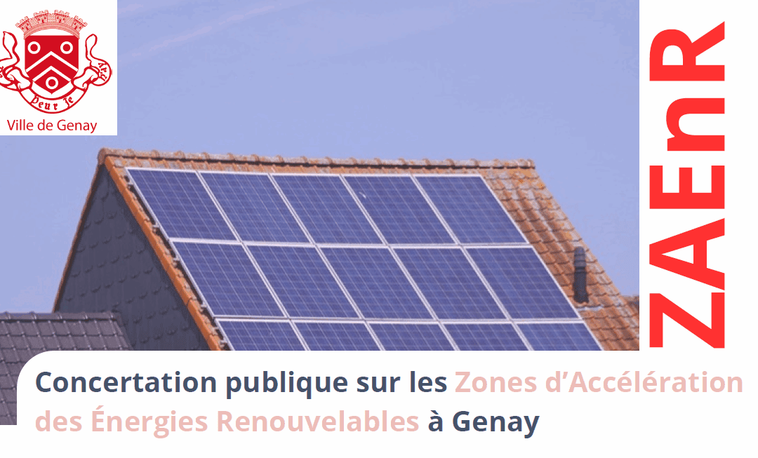 La Ville de GENAY vous consulte sur les énergies renouvelables (solaires photovoltaïques et solaires thermiques) qu’elle souhaite favoriser sur des zones définies de son territoire.