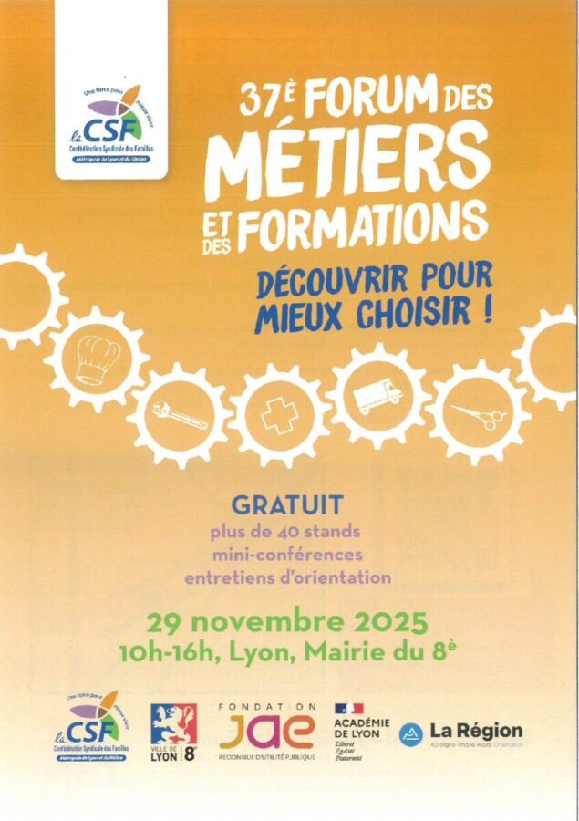 – Forum des métiers et des formations le Samedi 29 Novembre à Lyon, à la Mairie du 8e Arrondissement